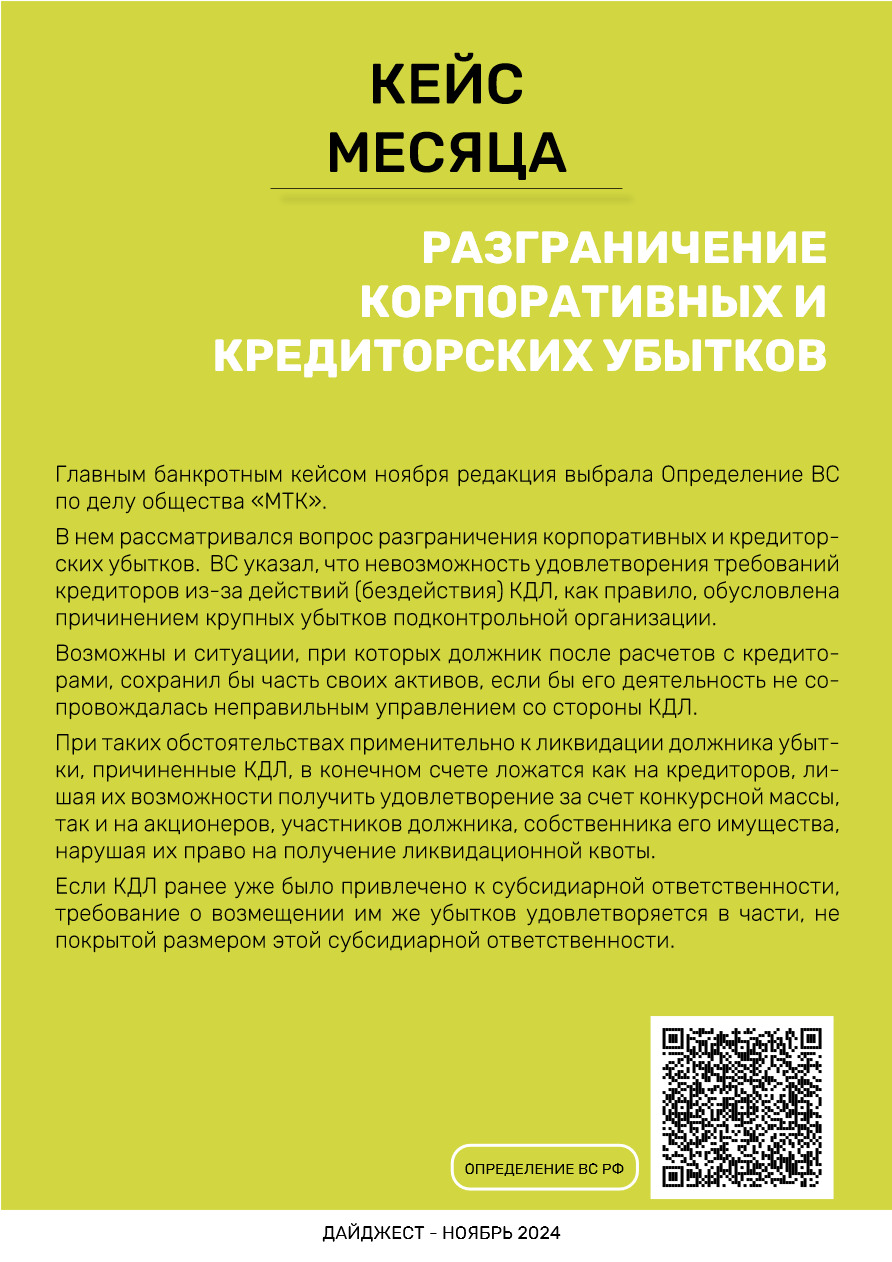 Главным банкротным кейсом ноября редакция выбрала Определение ВС по делу общества «МТК». В нем рассматривался вопрос разграничения корпоративных и кредиторских убытков. ВС указал, что невозможность удовлетворения требований кредиторов из-за действий (бездействия) КДЛ, как правило, обусловлена причинением крупных убытков подконтрольной организации. Возможны и ситуации, при которых должник после расчетов с кредиторами, сохранил бы часть своих активов, если бы его деятельность не сопровождалась неправильным управлением со стороны КДЛ. При таких обстоятельствах применительно к ликвидации должника убытки, причиненные КДЛ, в конечном счете ложатся как на кредиторов, лишая их возможности получить удовлетворение за счет конкурсной массы, так и на акционеров, участников должника, собственника его имущества, нарушая их право на получение ликвидационной квоты. Если КДЛ ранее уже было привлечено к субсидиарной ответственности, требование о возмещении им же убытков удовлетворяется в части, не покрытой размером этой субсидиарной ответственности.
