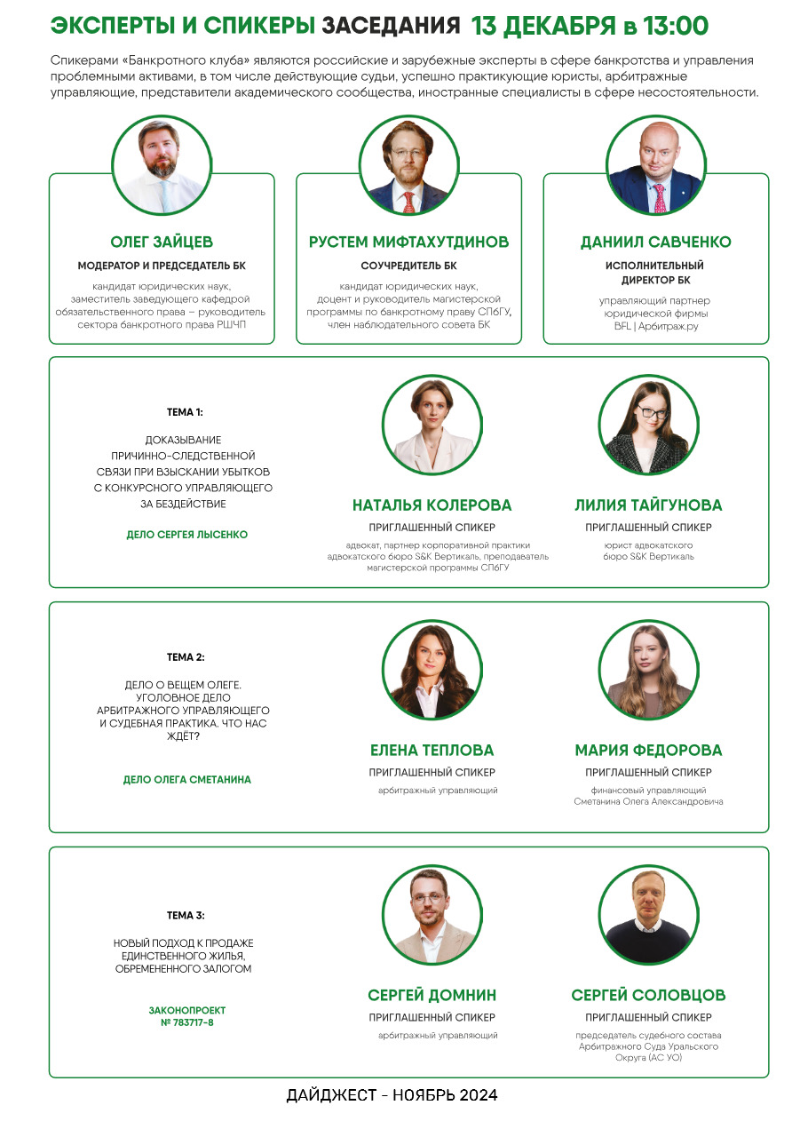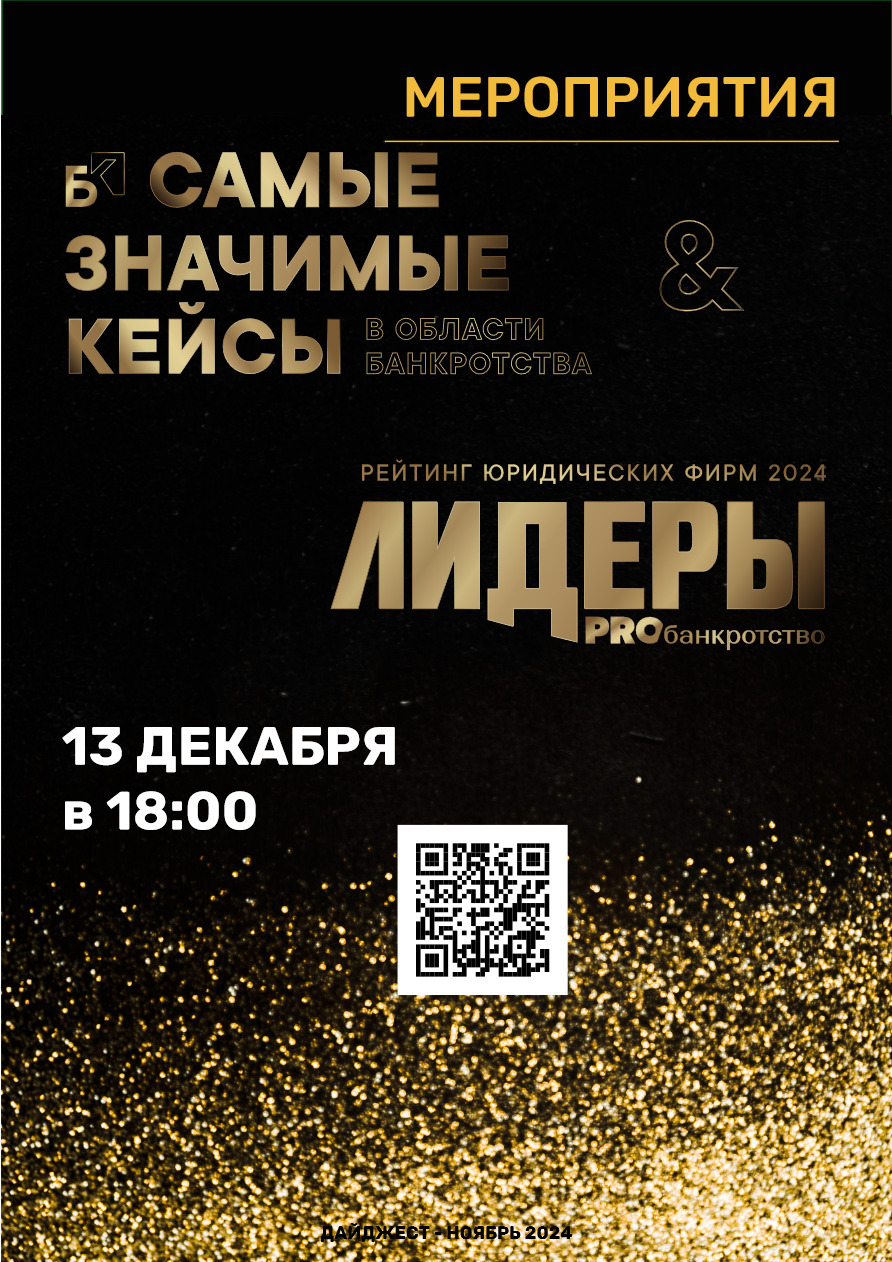 - 13 декабря Церемония награждения победителей премий «Самые значимые кейсы в области банкротства по версии экспертов Банкротного Клуба» и «Лидеры PROбанкротства. Рейтинг юридических фирм 2024».