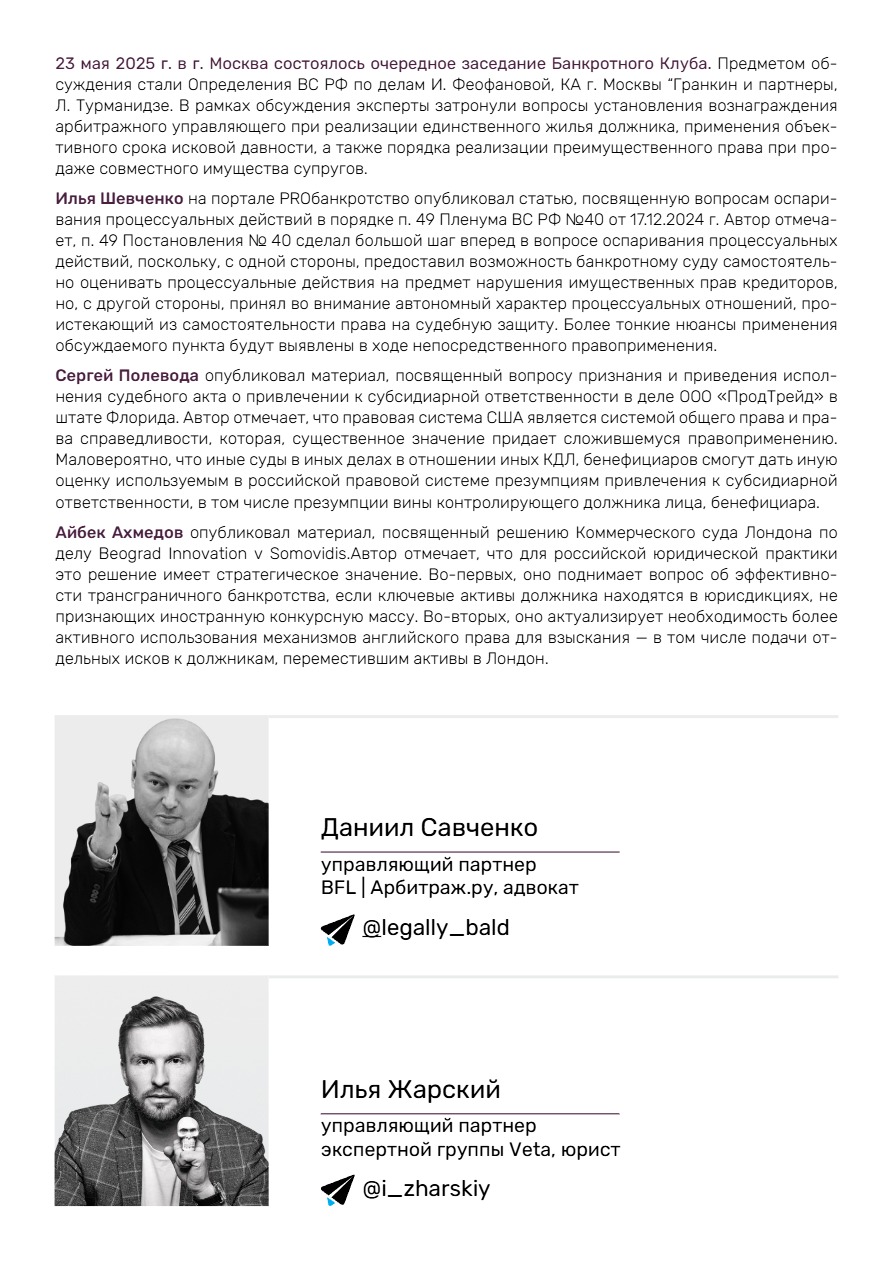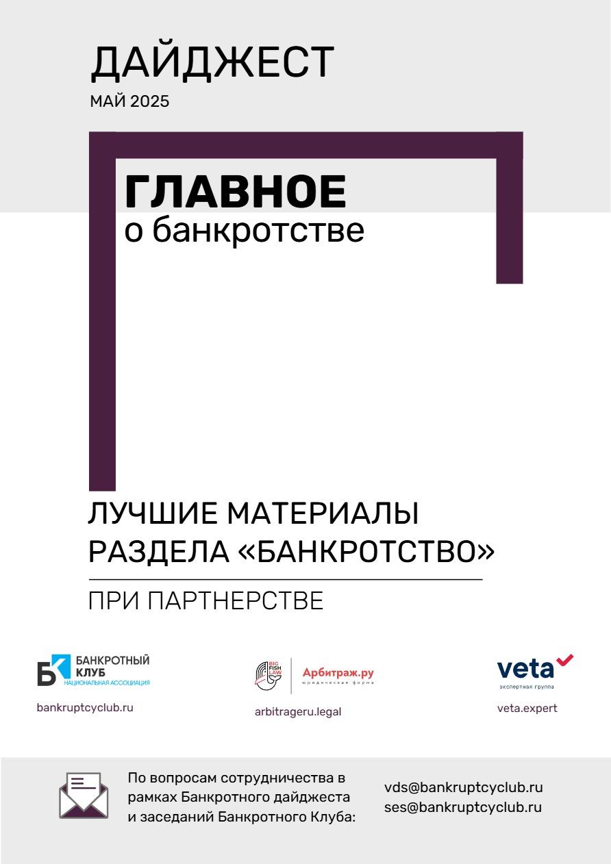 23 мая 2025 г. в г. Москва состоялось очередное заседание Банкротного Клуба. Предметом обсуждения стали Определения ВС РФ по делам И. Феофановой, КА г. Москвы “Гранкин и партнеры, Л. Турманидзе. В рамках обсуждения эксперты затронули вопросы установления вознаграждения арбитражного управляющего при реализации единственного жилья должника, применения объективного срока исковой давности, а также порядка реализации преимущественного права при продаже совместного имущества супругов.