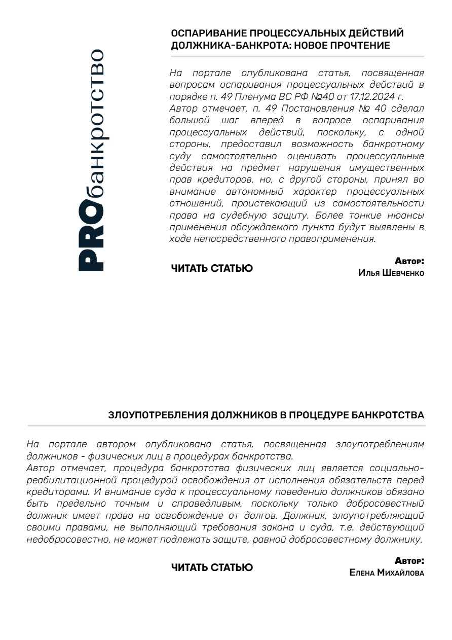 Илья Шевченко на портале PROбанкротство опубликовал статью, посвященную вопросам оспаривания процессуальных действий в порядке п. 49 Пленума ВС РФ №40 от 17.12.2024 г. Автор отмечает, п. 49 Постановления № 40 сделал большой шаг вперед в вопросе оспаривания процессуальных действий, поскольку, с одной стороны, предоставил возможность банкротному суду самостоятельно оценивать процессуальные действия на предмет нарушения имущественных прав кредиторов, но, с другой стороны, принял во внимание автономный характер процессуальных отношений, проистекающий из самостоятельности права на судебную защиту. Более тонкие нюансы применения обсуждаемого пункта будут выявлены в ходе непосредственного правоприменения.