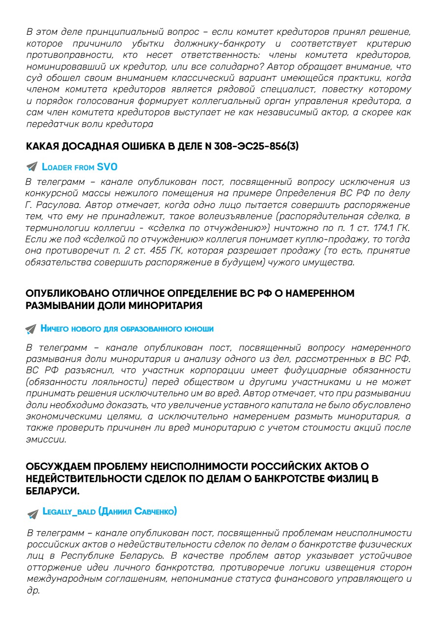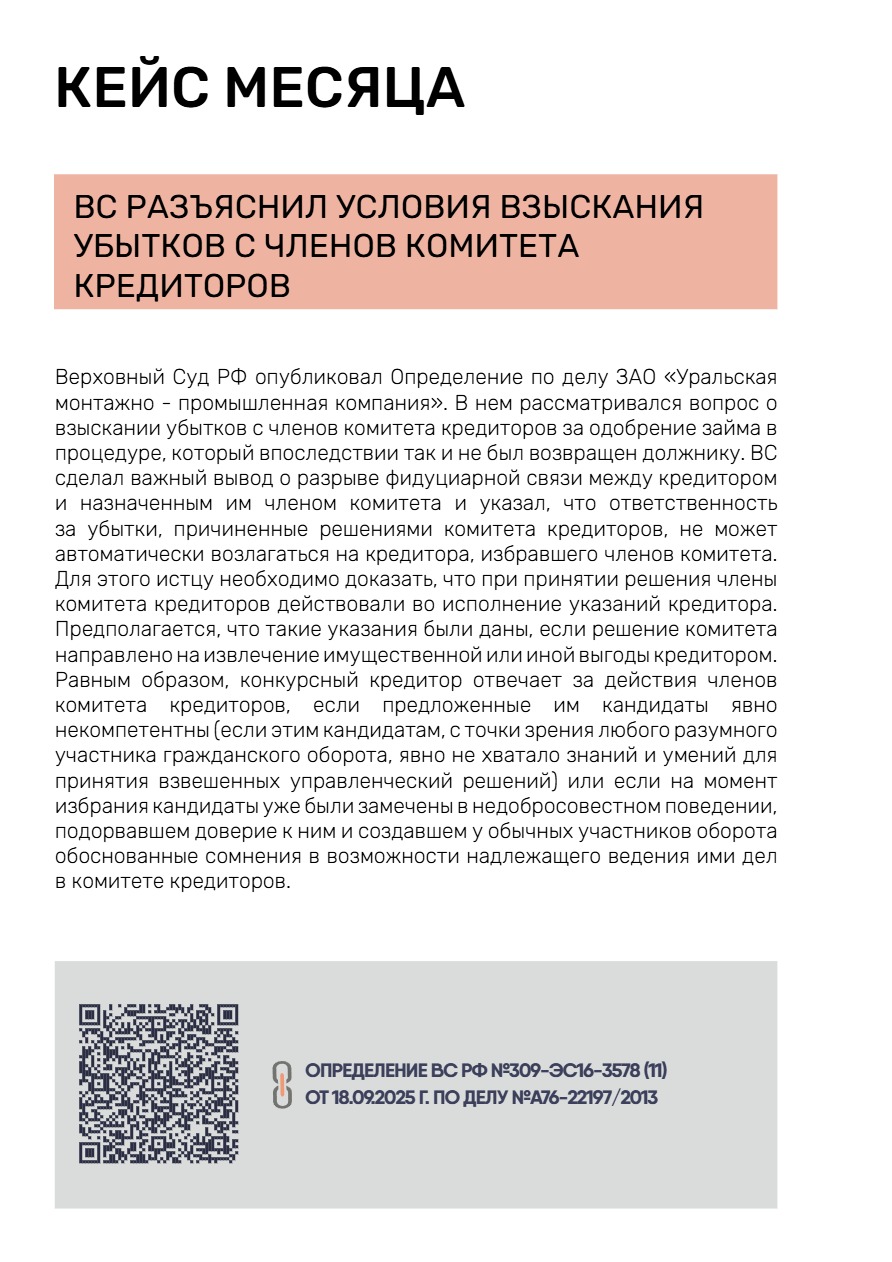 В этом деле у Верховного Суда появилась возможность разрешить важный для судебной практики вопрос о возможности взыскания убытков с членов комитета кредиторов за одобрение сделки. ВС сделал важный вывод о разрыве фидуциарной связи между кредитором и назначенным им членом комитета и указал, что ответственность за убытки, причиненные решениями комитета кредиторов, не может автоматически возлагаться на кредитора, избравшего членов комитета.