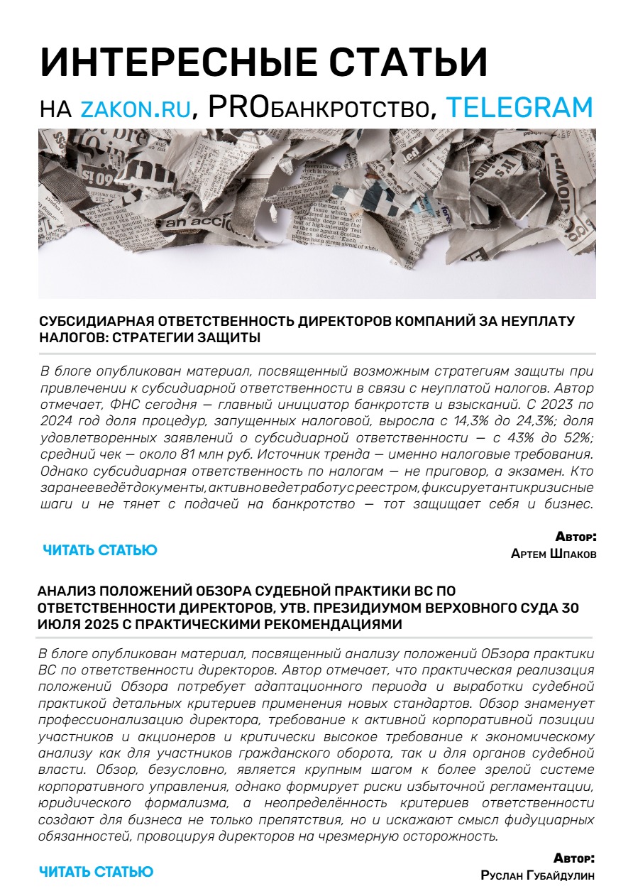 • Анализ положений Обзора судебной практики ВС по ответственности директоров, утв. Президиумом Верховного суда 30 июля 2025 с практическими рекомендациями.