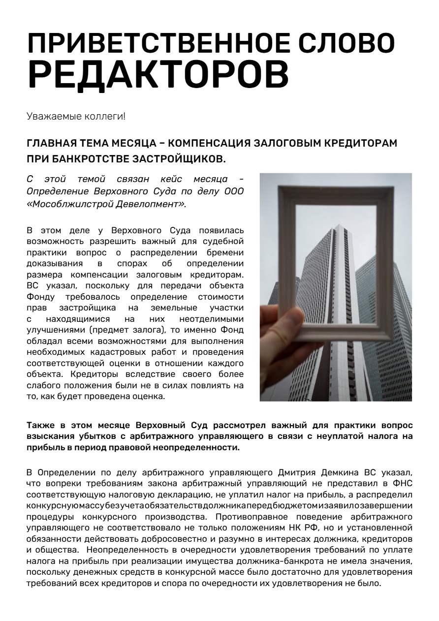 Главная тема месяца – компенсация залоговым кредиторам при банкротстве застройщиков.
