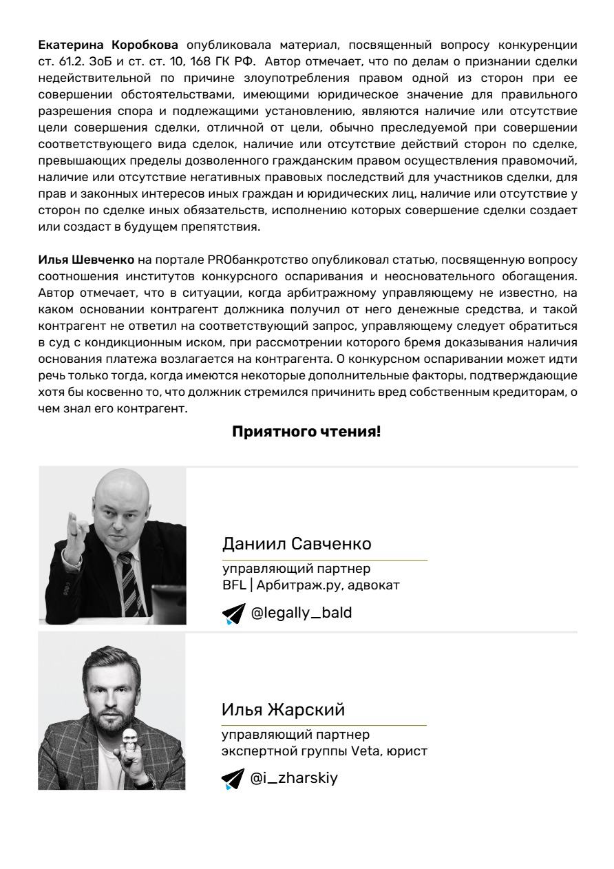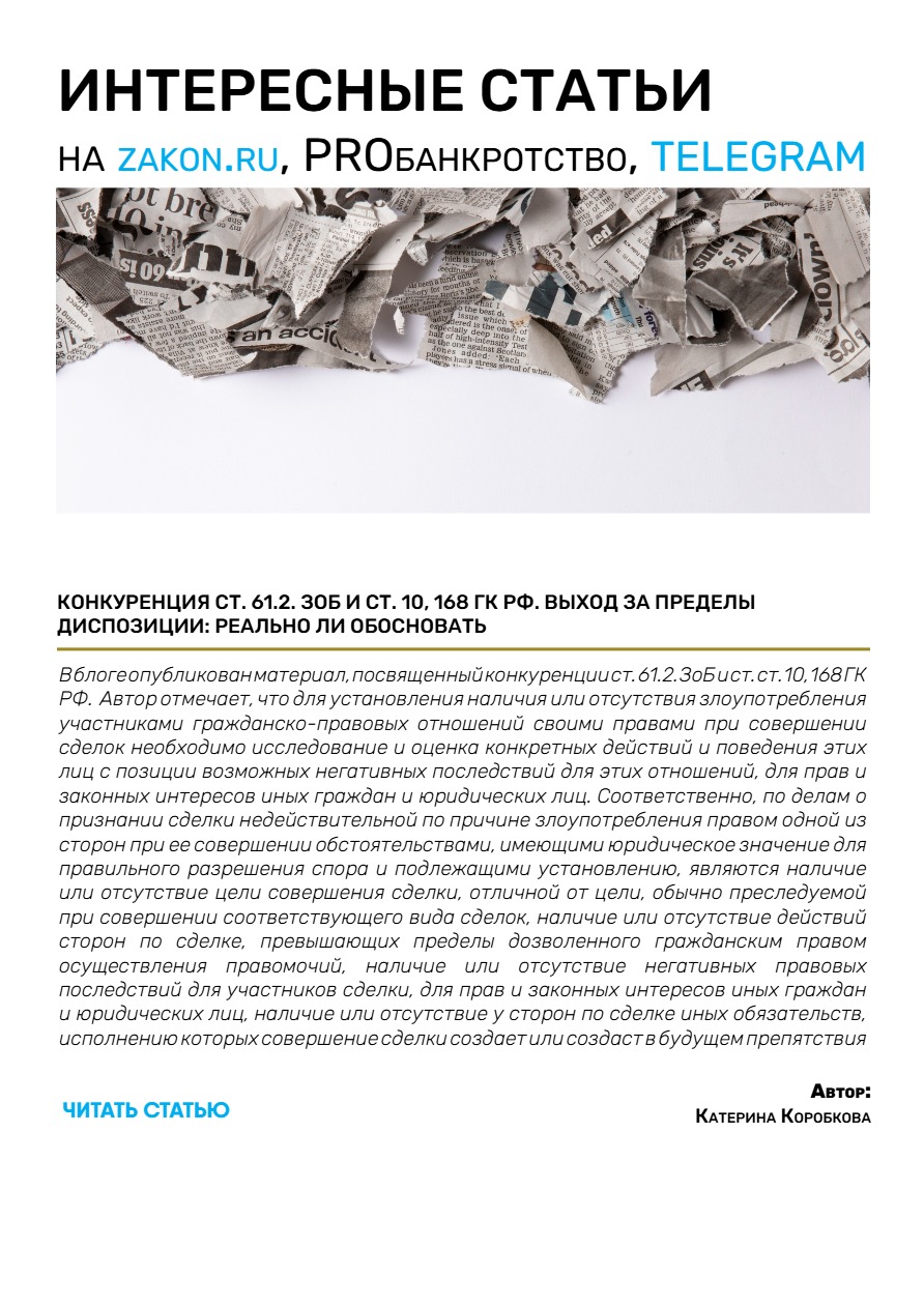 • Конкуренция ст. 61.2. ЗоБ и ст. ст. 10, 168 ГК РФ. Выход за пределы диспозиции: реально ли обосновать
