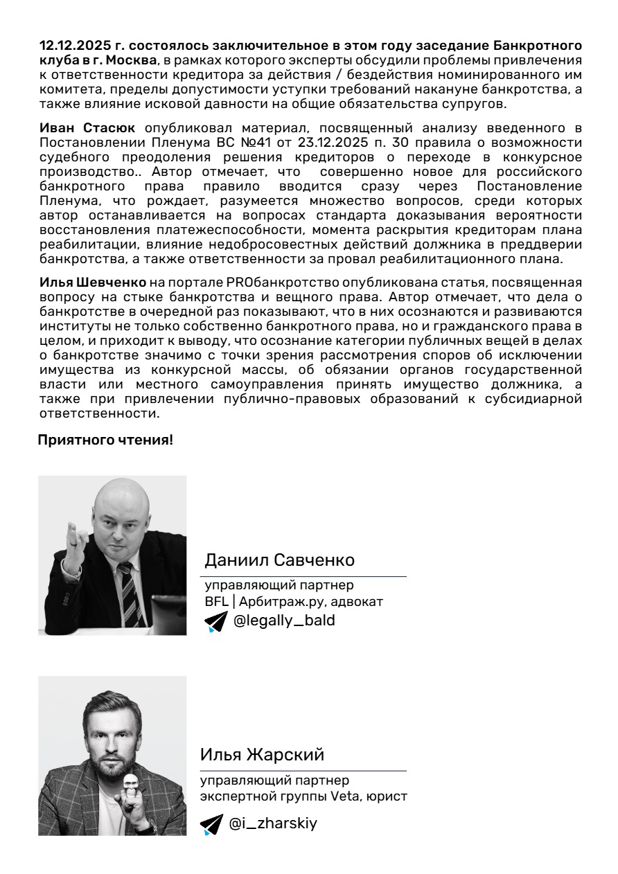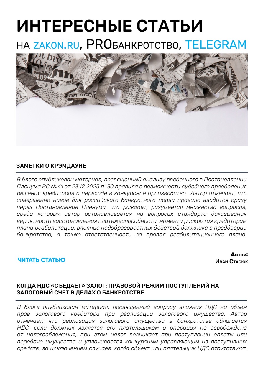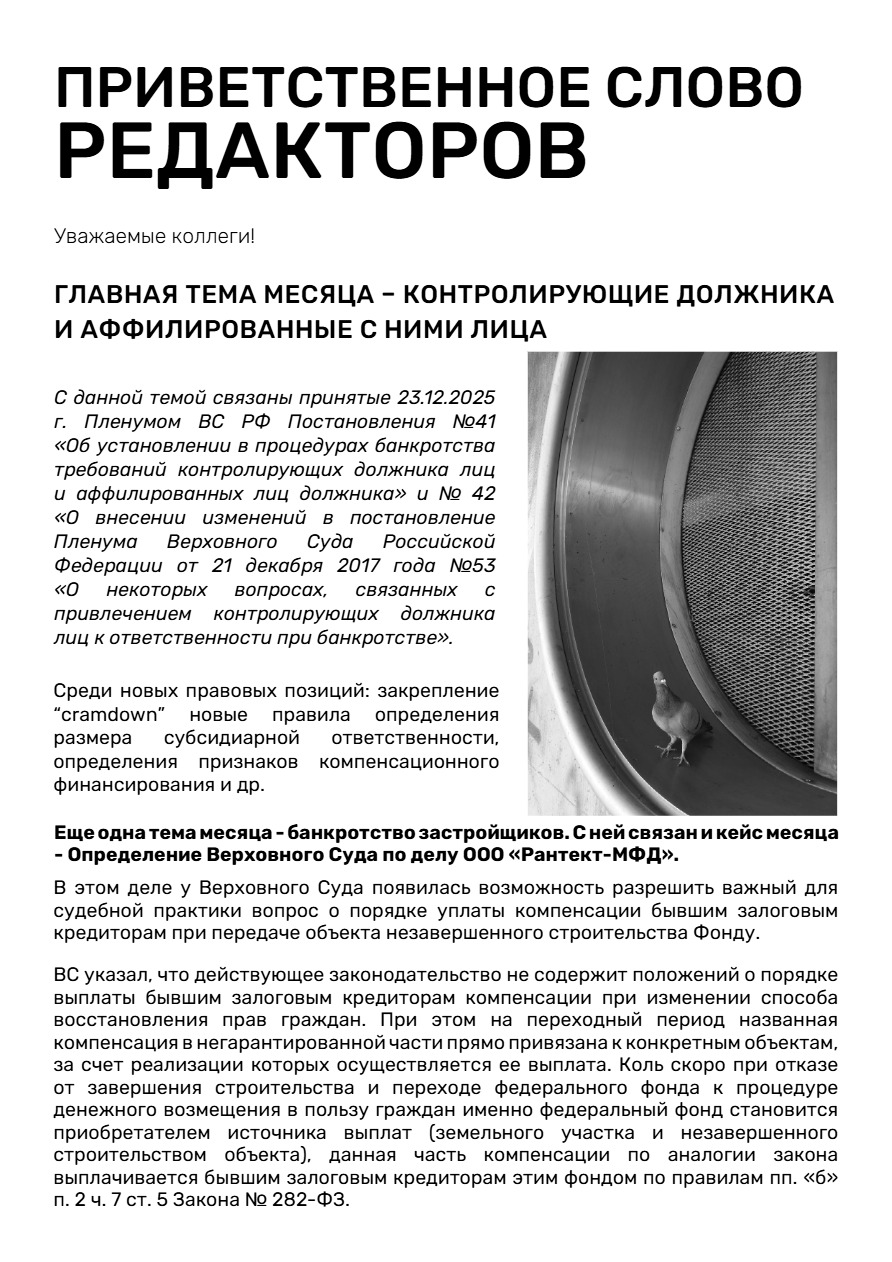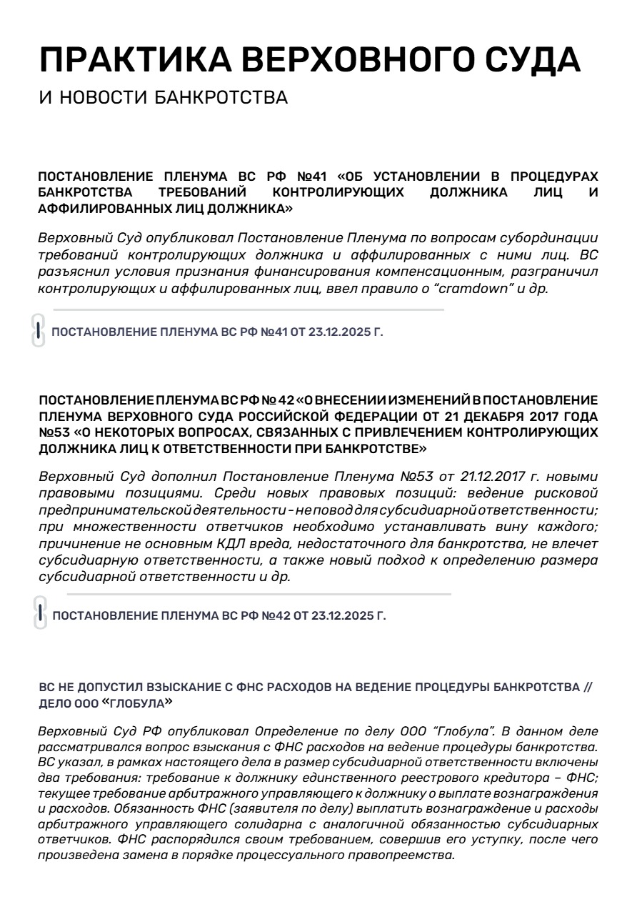 С данной темой связаны принятые 23.12.2025 г. Пленумом ВС РФ Постановления №41 «Об установлении в процедурах банкротства требований контролирующих должника лиц и аффилированных лиц должника» и № 42 «О внесении изменений в постановление Пленума Верховного Суда Российской Федерации от 21 декабря 2017 года №53 «О некоторых вопросах, связанных с привлечением контролирующих должника лиц к ответственности при банкротстве». Среди новых правовых позиций: закрепление “cramdown” новые правила определения размера субсидиарной ответственности, определения признаков компенсационного финансирования и др.