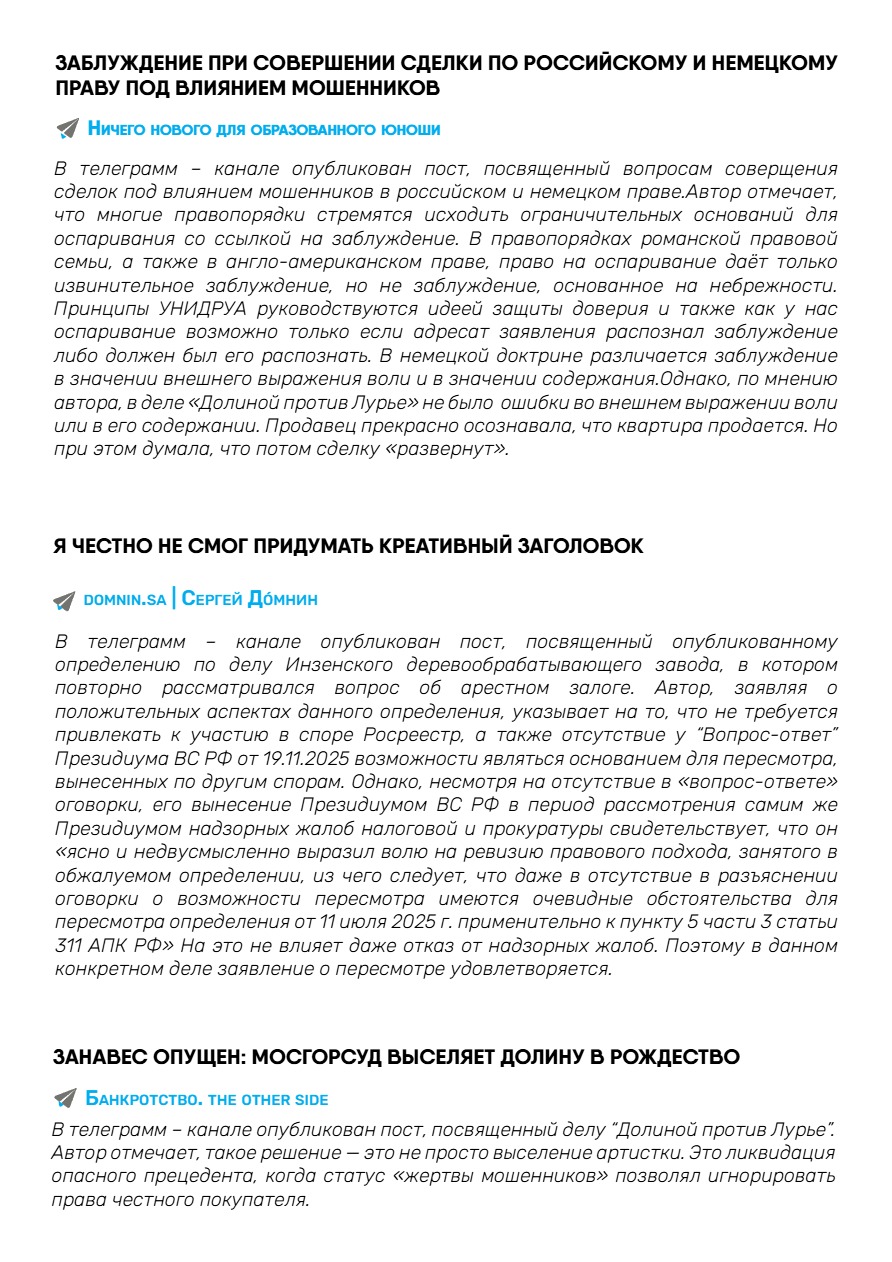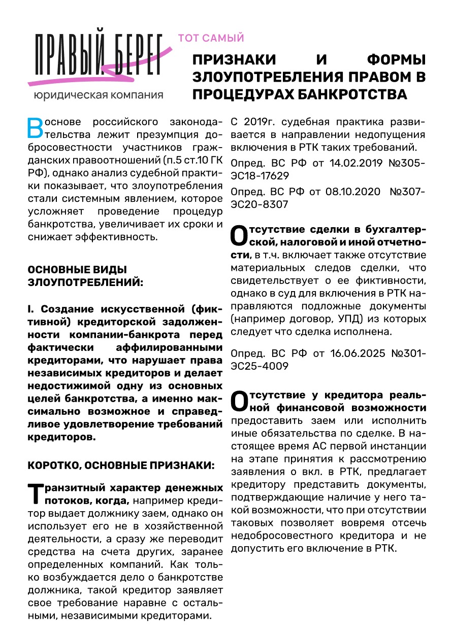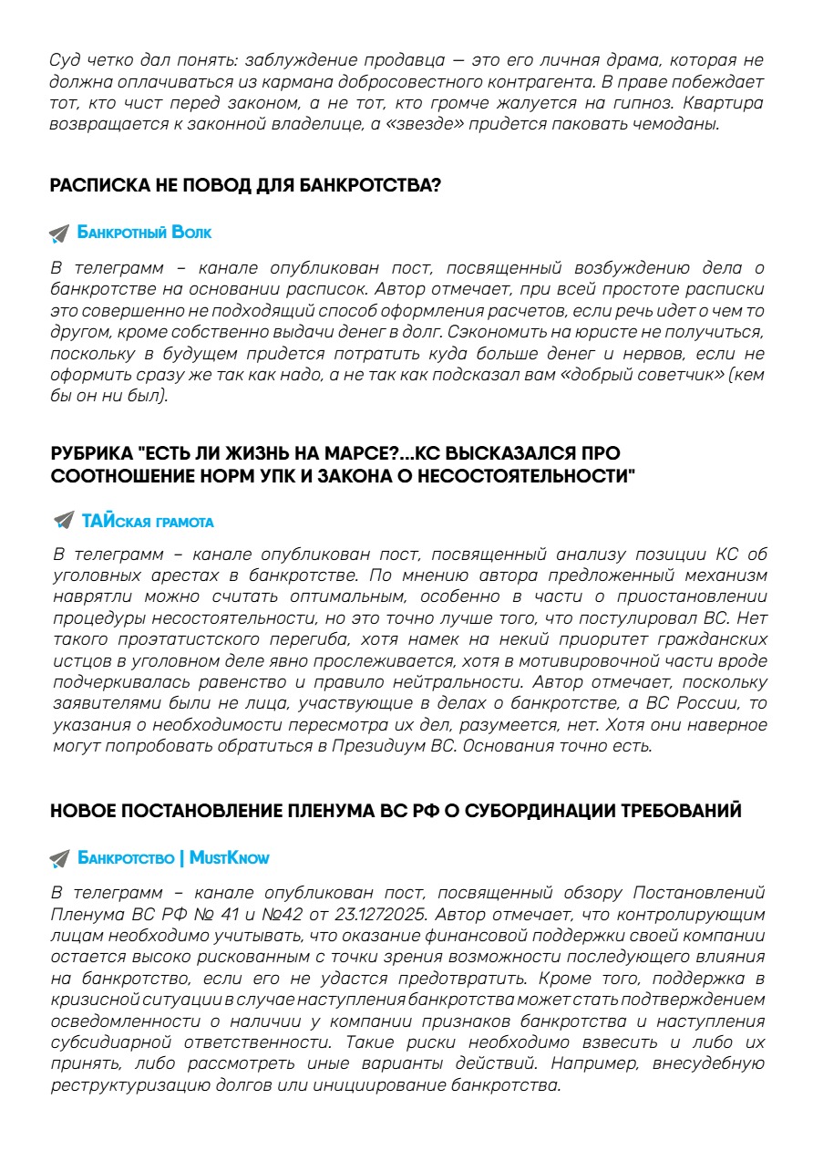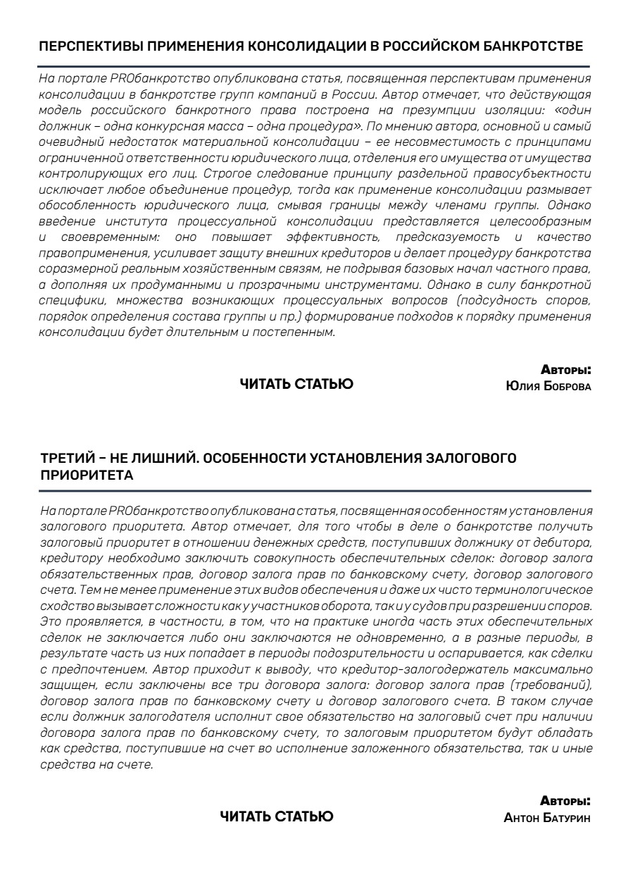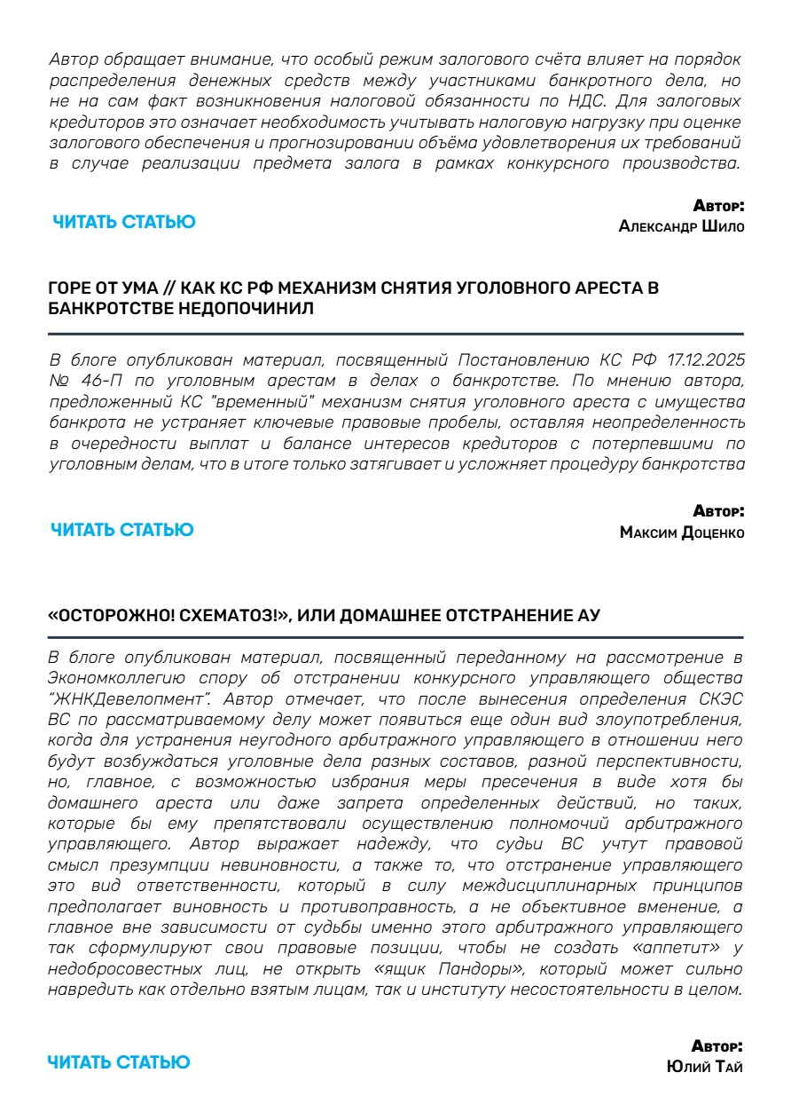 С данной темой связаны принятые 23.12.2025 г. Пленумом ВС РФ Постановления №41 «Об установлении в процедурах банкротства требований контролирующих должника лиц и аффилированных лиц должника» и № 42 «О внесении изменений в постановление Пленума Верховного Суда Российской Федерации от 21 декабря 2017 года №53 «О некоторых вопросах, связанных с привлечением контролирующих должника лиц к ответственности при банкротстве». Среди новых правовых позиций: закрепление “cramdown” новые правила определения размера субсидиарной ответственности, определения признаков компенсационного финансирования и др.